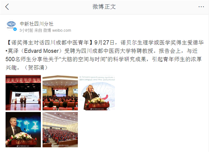 【诺奖得主对话四川成都中医青年】9月27日,诺贝尔生理学或医学奖得主爱德华•莫泽(Edvard Moser)受聘为四川pp电子官方网站特聘教授。报告会上,与近500名师生分享他关于“大脑的空间与时间”的科学研究成果,引起青年师生的浓厚兴趣。
