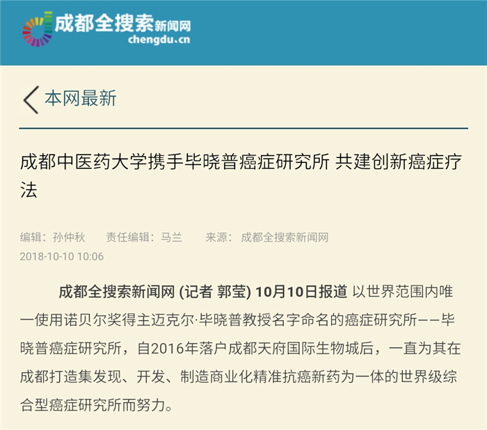 10月10日报道 以世界范围内唯一使用诺贝尔奖得主迈克尔·毕晓普教授名字命名的癌症研究所——毕晓普癌症研究所,自2016年落户成都天府国际生物城后,一直为其在成都打造集发现、开发、制造商业化精准抗癌新药为一体的世界级综合型癌症研究所而努力。