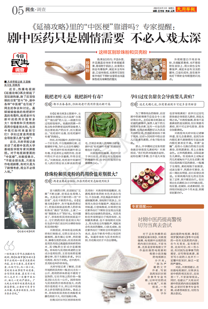 近日,热播电视剧《延禧攻略》再次掀起了宫廷剧热潮,除了后宫佳丽的日常“宫斗”外,剧中各种“中医梗”也引起了网友的争议和讨论。嘉嫔娘娘偷换的枇杷新叶真的有毒吗,枇杷老叶与新叶的药用价值有多大?珍珠粉和贝壳粉的药用价值差别大吗,生活中我们如何来鉴别它们?孕妇过度食用甜食会导致婴儿患“金瞳”?