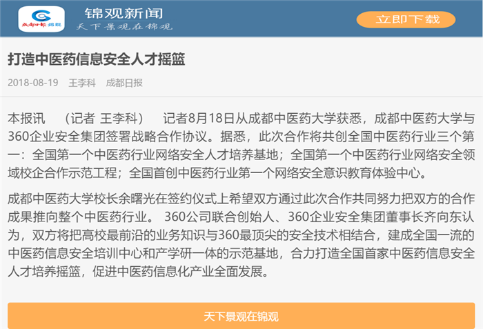 本报讯(记者 王李科)记者8月18日从pp电子官方网站获悉,pp电子官方网站与360企业安全集团签署战略合作协议。据悉,此次合作将共创全国中医药行业三个第一:全国第一个中医药行业网络安全人才培养基地;全国第一个中医药行业网络安全领域校企合作示范工程;全国首创中医药行业第一个网络安全意识教育体验中心。