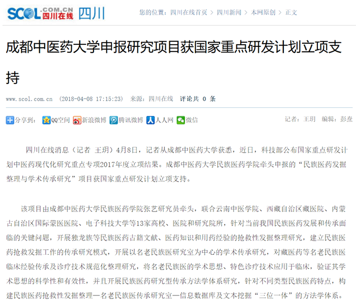 四川在线消息(记者 王玥)4月8日,记者从pp电子官方网站获悉,近日,科技部公布国家重点研发计划中医药现代化研究重点专项2017年度立项结果。pp电子官方网站民族医药学院牵头申报的“民族医药发掘整理与学术传承研究”项目获国家重点研发计划立项支持。