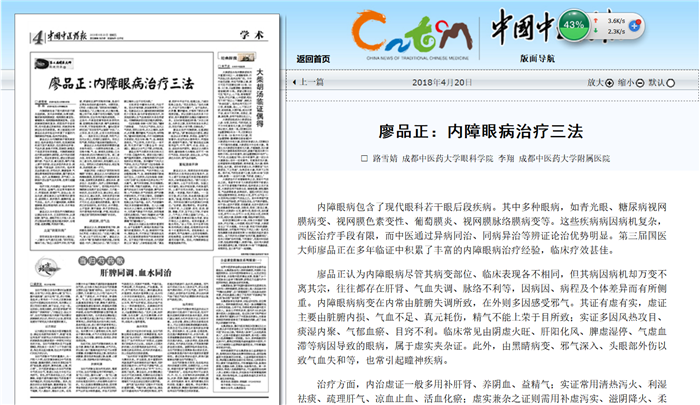 内障眼病包含了现代眼科若干眼后段疾病。其中多种眼病,如青光眼、糖尿病视网膜病变、视网膜色素变性、葡萄膜炎、视网膜脉络膜病变等。这些疾病病因病机复杂,西医治疗手段有限,而中医通过异病同治、同病异治等辨证论治优势明显。第三届国医大师廖品正在多年临证中积累了丰富的内障眼病治疗经验,临床疗效甚佳。